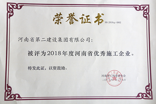 乐鱼线上平台(集团)官方网站荣获“2018年度河南省优秀施工企业”